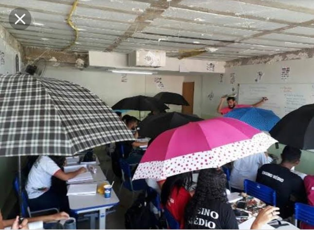 Entre os desafios, está este de lecionar debaixo de chuva dentro da sala de aula