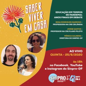 Como forma de debater o assunto, o programa Saber Viver em Casa desta quinta-feira (25) abordará a “Educação em Tempos de Pandemia: Anos Finais em debate” que contará como convidados (as) Edna Rodrigues Barroso, professora da CRE Ceilândia e Jorge Santos, professor da CRE Plano Piloto, educadores que estão atuando no novo modelo de teletrabalho na etapa dos Anos Finais. Além dos convidados, a diretora do Sinpro Mônica Caldeira mediará o diálogo.
