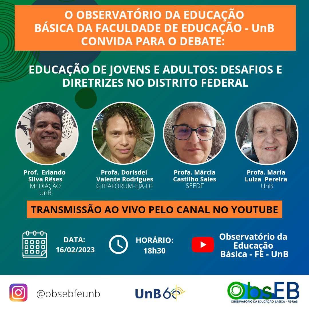 O Observatório da Educação Básica da Faculdade de Educação da Universidade de Brasília (ObsEB/UnB) debate Educação de Jovens e Adultos: desafios e diretrizes no Distrito Federal no dia 16 de fevereiro, iniciando a transmissão ao vivo às 18h30, no canal do Observatório no YouTube. O debate contará com a participação das professoras Dorisdei Valente Rodrigues (GTPAForum-EJA-DF); Márcia Castilho Sales, da Secretaria de Educação do DF (SEEDF); e Maria Luiza Pereira, da Universidade de Brasília (UnB). A mediação ficará sob a responsabilidade do professor Erlando Silva Rêses, da UnB.