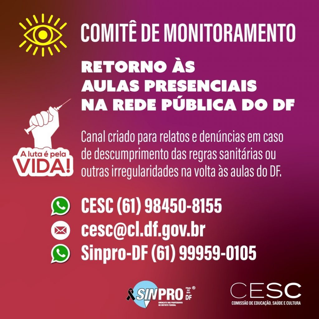 Para instituir esse monitoramento, na prática, foram disponibilizados canais de comunicação, com telefones conectados ao WhatsApp para a categoria, os(as) estudantes e a comunidade escolar relatarem ou denunciarem eventos e situações que contradizem às regras sanitárias, coloquem a vida em risco e toda e qualquer irregularidade neste retorno imposto pelo Governo do Distrito Federal (GDF).