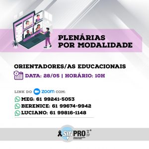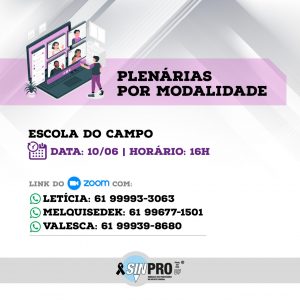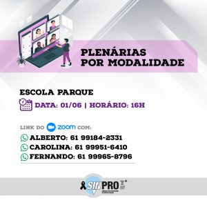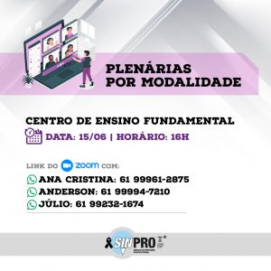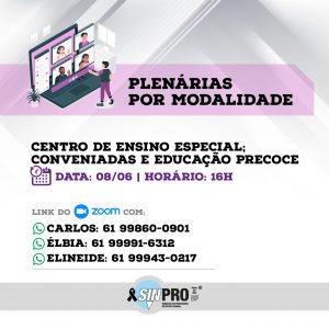 Seguindo o calendário de mobilizações aprovado pela categoria na última Assembleia Virtual, o Sinpro-DF convida toda a categoria para a participação da segunda edição das Plenárias por modalidades que será realizada nesta terça-feira (25), a partir das 16h, por meio da plataforma Zoom.