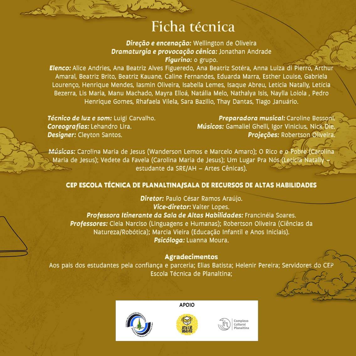 A obra conta a história de luta e sobrevivência de Carolina Maria de Jesus, uma das mais importantes escritoras brasileiras. No processo de criação da peça descobrem fatos interessantes sobre a vida da autora, cantora e poetisa, abordando os processos de apagamento da sua obra e o silenciamento de uma voz que denunciava o sofrimento e a miséria que marcavam a realidade da favela.