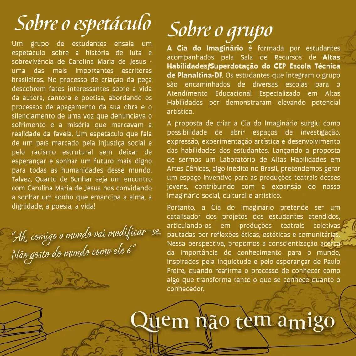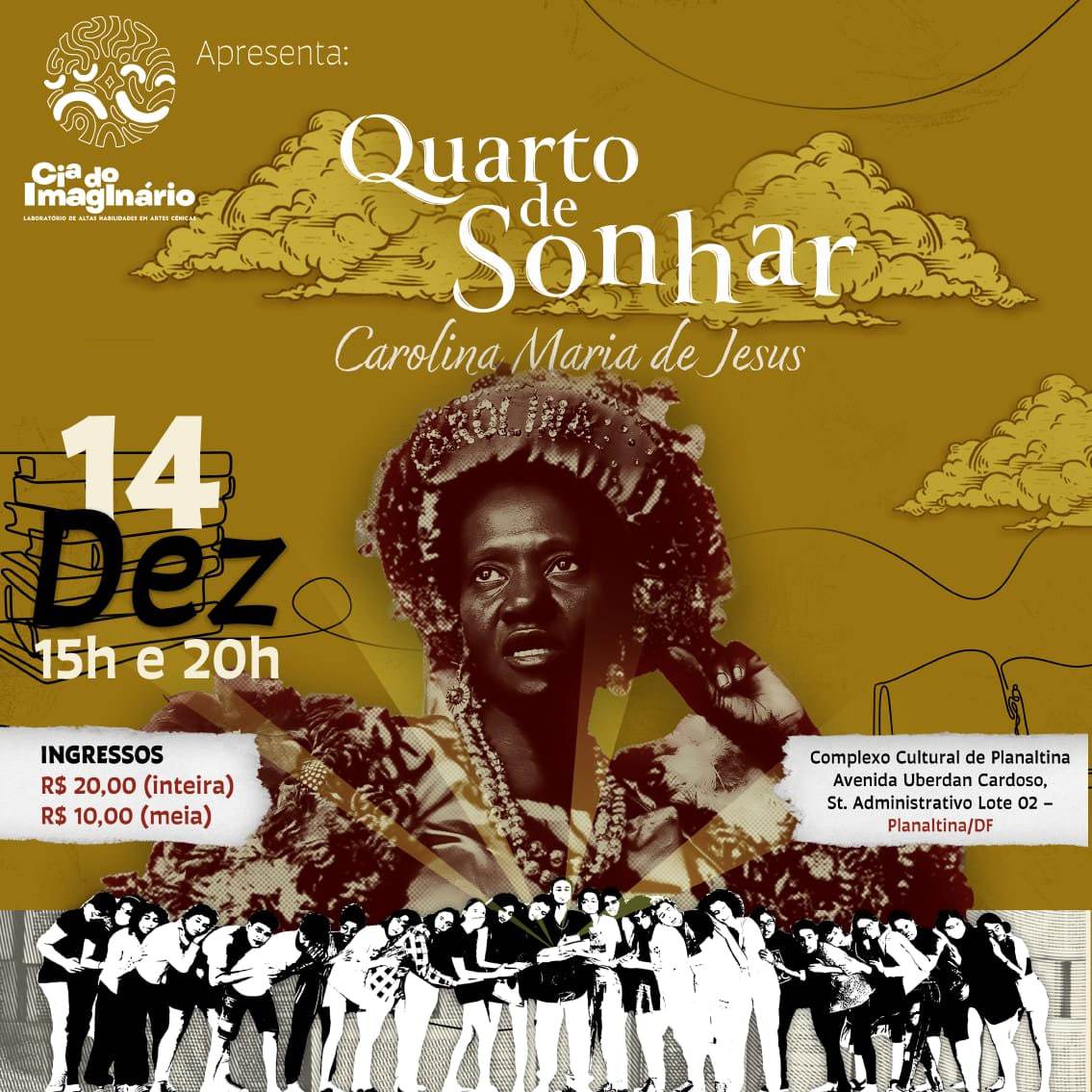 Estudantes da Escola Técnica de Planaltina/Sala de Recursos de Altas Habilidades apresentam o espetáculo Quarto de Sonhar – Carolina Maria de Jesus. A peça será exibida no dia 14 de dezembro, às 15h e 20h, no Complexo Cultural de Planaltina (Avenida Uberdan Cardoso, St. Administrativo, Lote 02). Os Ingressos serão vendidos a R$ 20,00 (inteira) e R$ 10,00 (meia-entrada).