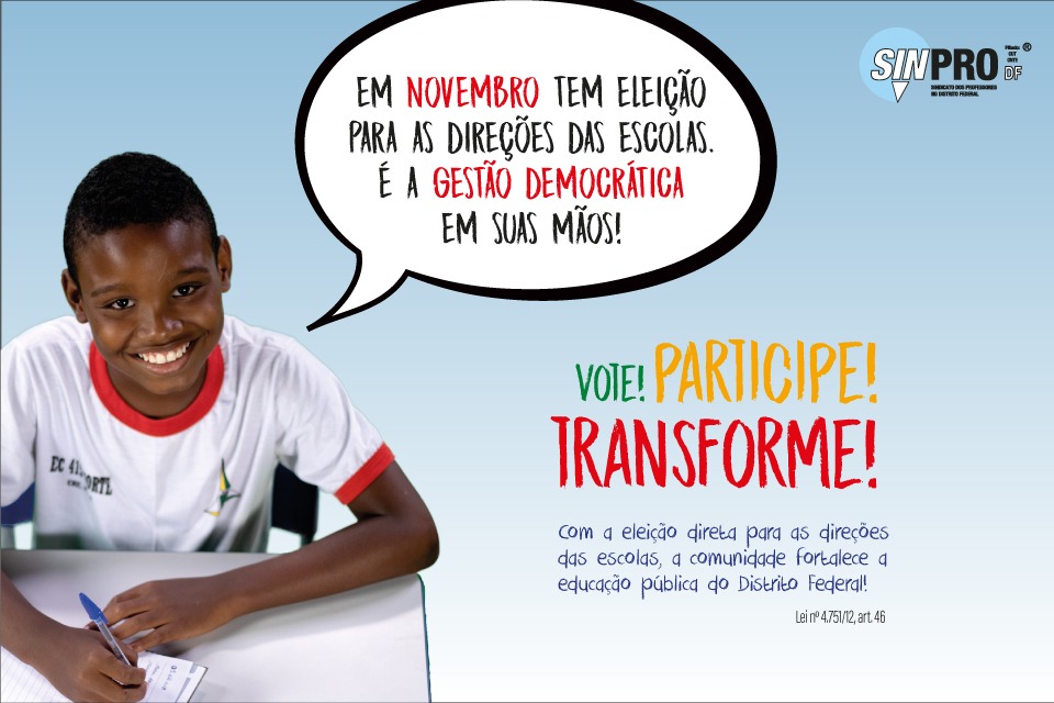 A cada três anos, estudantes, professores(as), orientadores(as), pais e demais servidores(as) da rede pública de ensino se organizam para eleger novos(as) diretores(as) e vice-diretores(as) para as escolas do Distrito Federal. Faltam poucos meses para as eleições diretas e o Sinpro orienta a todas as comunidades escolares que participem ativamente do pleito. Este ano, a expectativa é de que o processo eleitoral aconteça na última semana de novembro.