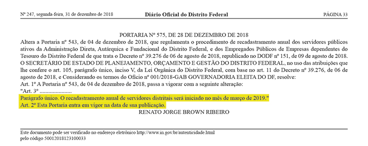 O recadastrando dos(as) servidores(as) públicos(as) da ativa só será feito a partir de março de 2019, conforme a Portaria nº 575/18, publicada no Diário Oficial do Distrito Federal (DODF) de 31 de dezembro de 2018. Anteriormente, havíamos informado que o procedimento seria feito no mês de janeiro para os(as) professores(as) e orientadores(as) educacionais que fazem aniversário em janeiro, mas o Governo do Distrito Federal (GDF) informou, somente agora, que, com a republicação da portaria, o recadastramento só será feito a partir de março.