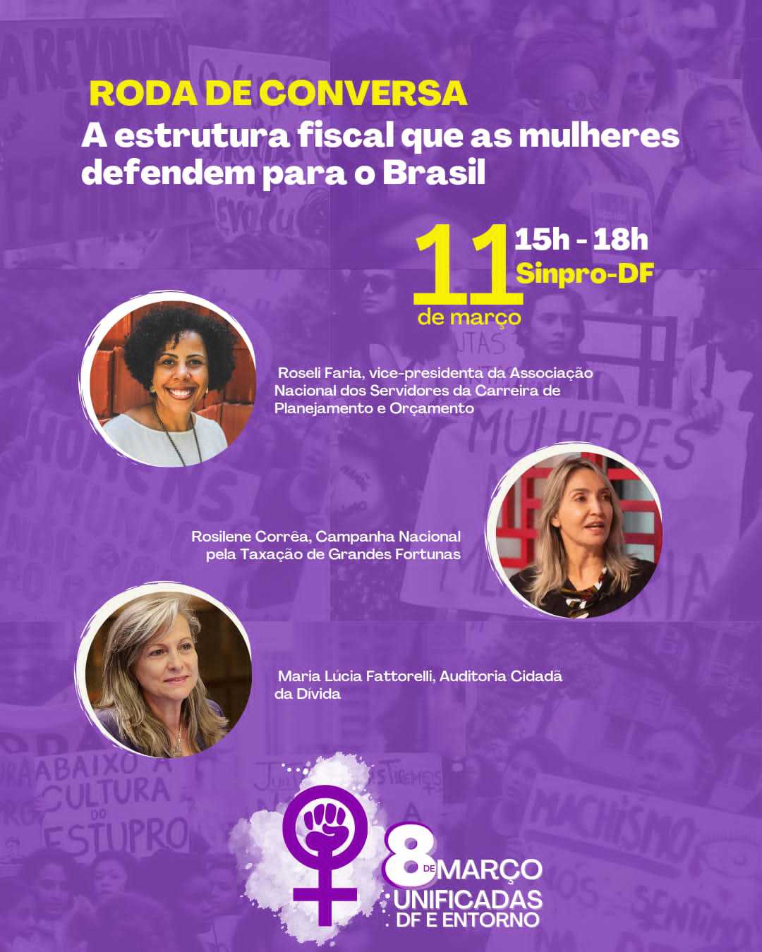 O 8 de Março Unificadas DF e Entorno, que agrega diversos movimentos, coletivos e associações de mulheres, realiza, neste sábado, 11 de março, uma roda de conversa com o tema A estrutura fiscal que as mulheres defendem para o Brasil. O encontro acontece às 15h no auditório do Sinpro-DF, no SIG.