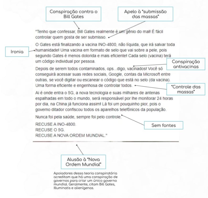 Apesar de todos esses problemas, é possível aproveitarmos as Fake News como material em sala de aula. É possível identificar uma série de características dos textos das Fake News, bem como debater e aprender meios de combatê-las. A seguir, listamos algumas características clássicas de uma Fake News, para se debater em sala de aula. A imagem abaixo é parte integrante do PDF disponível neste link. Há vários outros exemplos. Material bem didático: