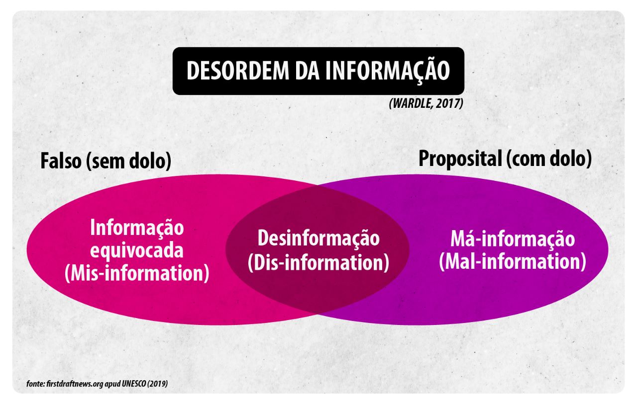 A doutora Claire Wardle, da Harvard Kennedy School, apresenta, então, a ideia de desordem da informação. E, a partir daí, diferencia os processos de desordem da informação em três categorias diferentes: misinformation, disinformation e malinformation que, em português, viram informação equivocada, desinformação e má-informação. (Figura abaixo)