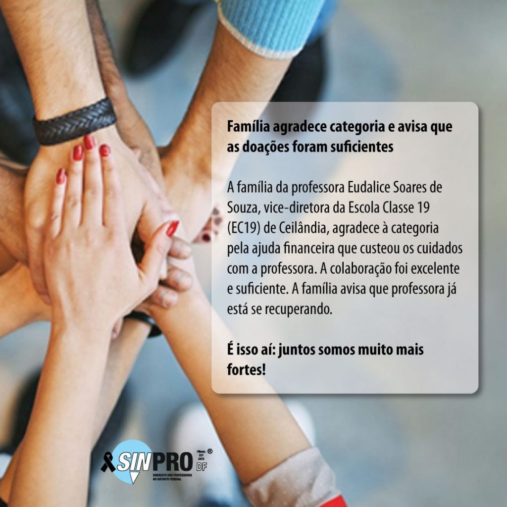 A família da professora Eudalice Soares de Souza, vice-diretora da Escola Classe 19 (EC19) de Ceilândia, agradece à categoria pela ajuda financeira que custeou os cuidados com a professora. A colaboração foi excelente e suficiente. A família avisa que professora já está se recuperando.