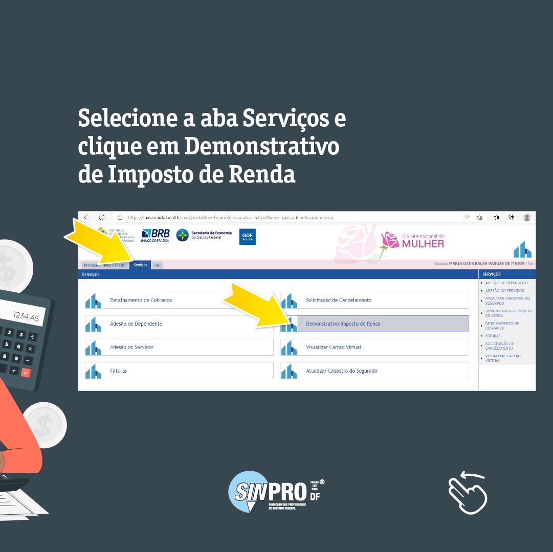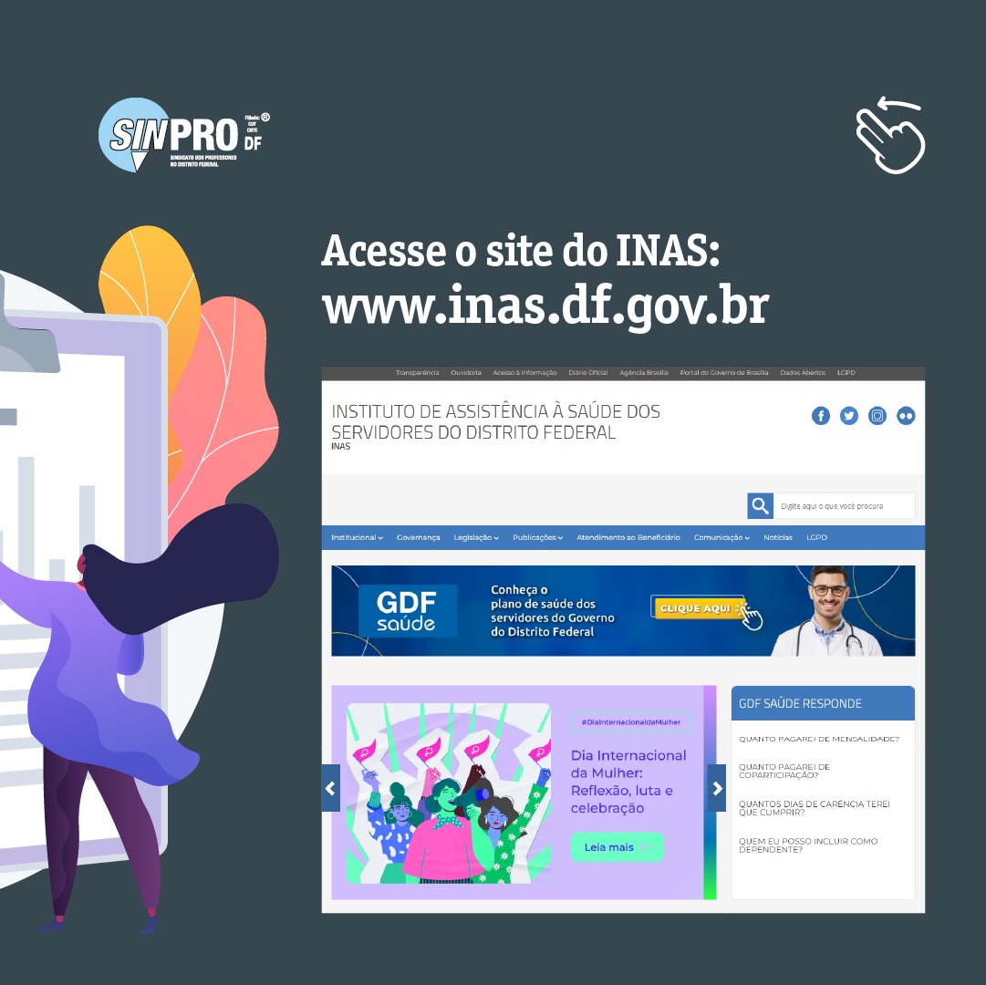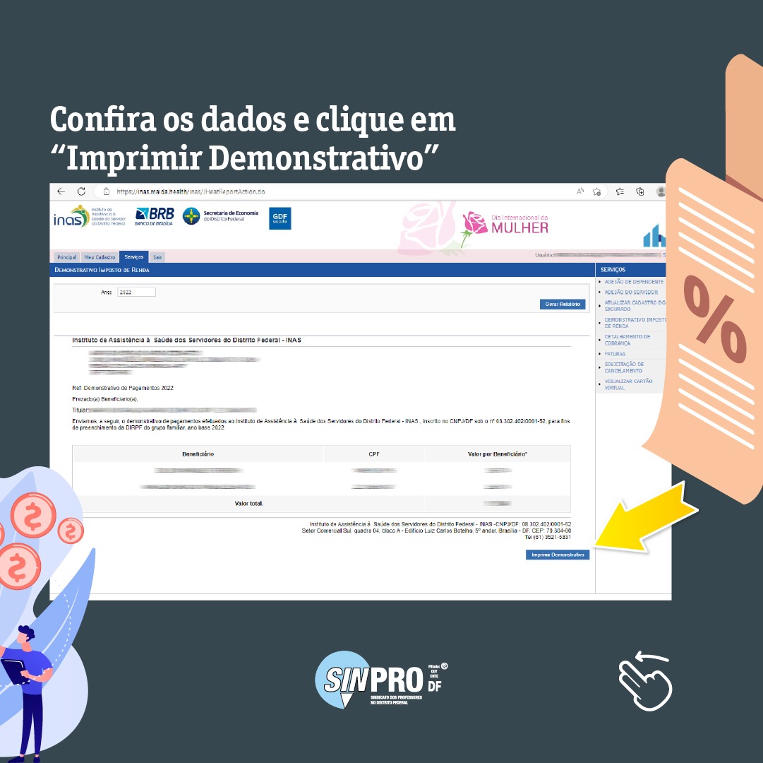 Devido à demanda de professores(as) e orientadores(as) educacionais beneficiários(as) do plano de saúde do GDF Saúde (INAS) procurando o Sinpro para tirar dúvidas referentes à declaração do Imposto de Renda, informamos que o demonstrativo do IR para a Declaração 2023 já está disponível no site do Instituto de Assistência à Saúde dos Servidores do Distrito Federal (www.inas.df.gov.br), no Cadastro do Beneficiário.
