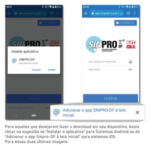 Aqueles que desejarem baixar o arquivo no celular, ou seja, fazer o download em seu dispositivo, pode clicar na sugestão de “Instalar o aplicativo” (no sistema Android) ou “Adicionar o app Sinpro-DF à tela inicial” (no sistema iOS).