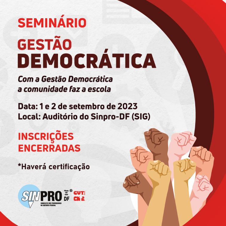 Começa nesta sexta-feira (1º/9) e prossegue até este sábado (2), o seminário sobre Gestão Democrática. Haverá certificação para os(as) participantes inscritos(as) e o seminário será realizado no Auditório Paulo Freire, na sede do Sinpro no Setor de Indústrias Gráficas (SIG). Além de informações sobre o processo eleitoral para a escolha de gestores e conselho escolar, que ocorre no segundo semestre, o seminário promoverá debates sobre o Panorama Geral da Gestão Democrática, base legal e arcabouço jurídico e a questão da gestão democrática e igualdade de gênero.