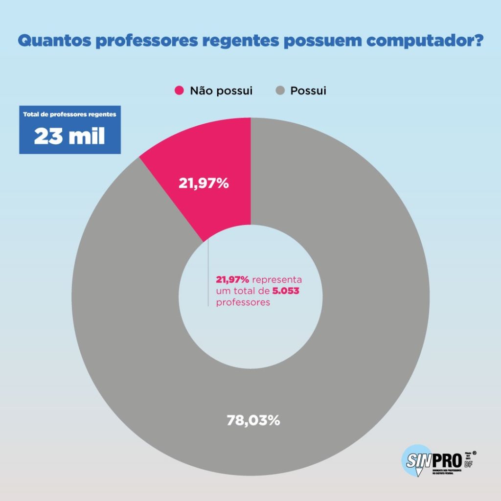 A pesquisa feita com professores(as) e orientadores(as) educacionais, por sua vez, constatou que e que 22,25% dos professores(as)/orientadores(as) não têm computadores. Quando desmembramos os dois segmentos da categoria do magistério público, constatamos que, dos 35 mil professores(as) da rede pública do DF, 23 mil são professores(as) que estão em sala de aula, ou seja, são denominados professores regentes, e, entre os regentes, 21,97% não têm computador. Ou seja, cinco mil professores regentes não têm computador e não têm como executar suas atividades pedagógicas.