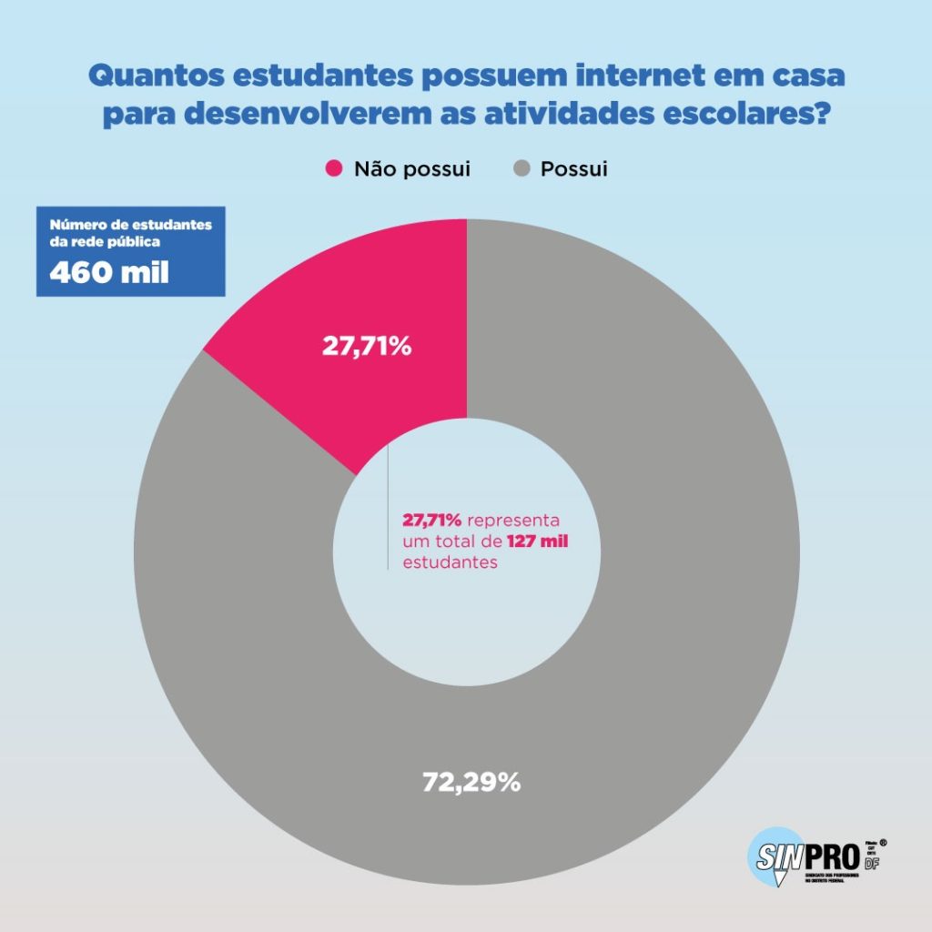 A série de matérias intitulada “Exclusão educacional no DF” – que têm registrado o resultado dessas pesquisas – revela que, dos 460 mil estudantes da rede pública de ensino do DF, 27,71%, ou seja, 127 mil estudantes não têm conexão com a rede mundial de computadores em casa para as atividades escolares.