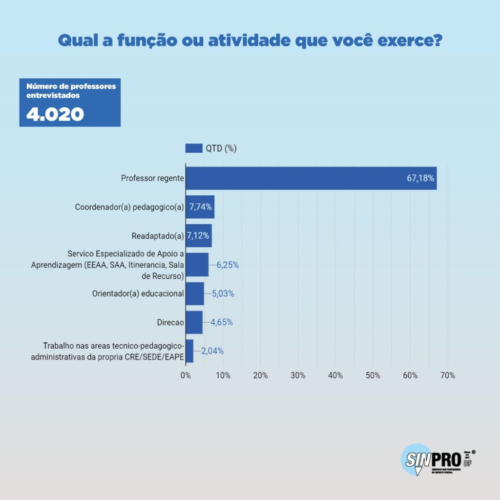 A pesquisa revelou que 67,18% da categoria é formada por professores regentes e que cinco mil deles não têm computador em casa. Entre as informações pesquisadas, detectou o dado positivo de que 98% da categoria têm acesso à Internet. O que não constatou é se há qualidade nessa conexão residencial, uma vez que, para participarem do Programa Escola em Casa DF, os(as) regentes terão de utilizar uma Internet de banda larga eficiente, capaz materializar e encaminhar o trabalho docente, com programação de aulas, áudios, vídeos, documentos eletrônicos e impressões voltados para a EaD.