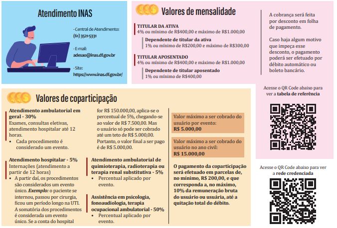 O Folha do Professor número 209 explica que “o GDF Saúde atua na modalidade de coparticipação e está desvinculado das regras da Agência Nacional de Saúde Suplementar (ANS). O plano de saúde conta com subsídio do GDF, que corresponde a 1,5% do valor total da folha de pagamento, e com o financiamento de seus próprios beneficiários, por meio do pagamento de mensalidades por titulares e dependentes. Sua gestão e administração são inteiramente conduzidas pelo INAS”.