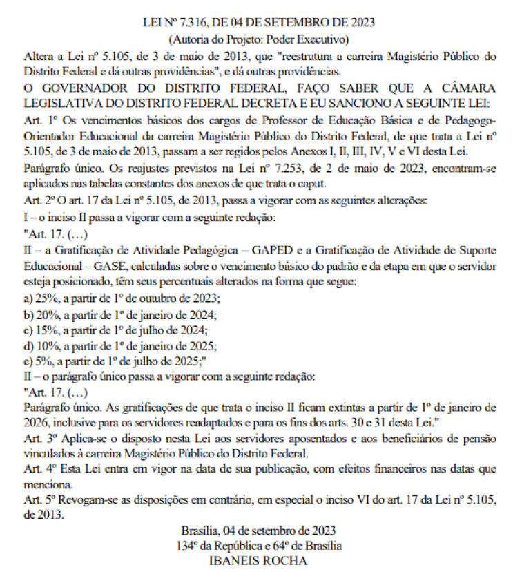 Luta histórica da categoria materializada em lei: foi publicada no Diário Oficial do Distrito Federal (DODF), desta terça-feira (5/9), a Lei nº 7.316, de 4 de setembro de 2023, que altera a Lei nº 5.105/2013, e reestrutura a carreira Magistério Público do Distrito Federal para incorporar a Gratificação de Atividade Pedagógica (Gaped) e a Gratificação de Atividade de Suporte Educacional (Gase) ao vencimento.
