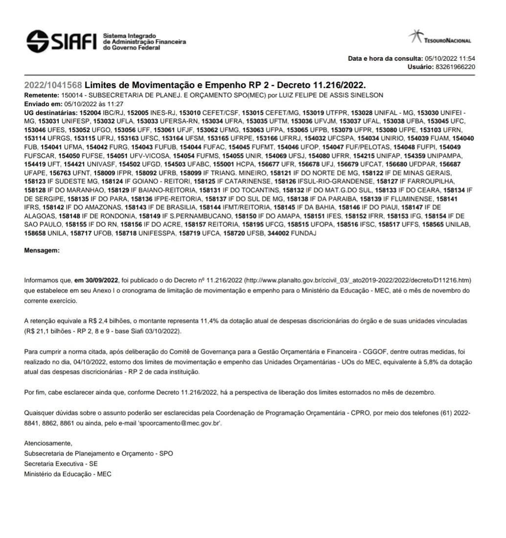 Este valor, se somado ao montante que já havia sido bloqueado ao longo de 2022, perfaz um total de R$ 763 milhões retirados das universidades federais do orçamento que havia sido aprovado para este ano. Nesta terça-feira, 4 de outubro, fomos chamados pelo Secretário da Educação Superior, Wagner Vilas Boas de Souza, para reunião, juntamente com o secretário adjunto da Secretaria de Educação Superior (SESu) do MEC, Eduardo Salgado, e, na nesta quarta-feira, a diretoria executiva da Andifes e sua secretaria executiva ouviram o seguinte detalhamento deste contingenciamento: