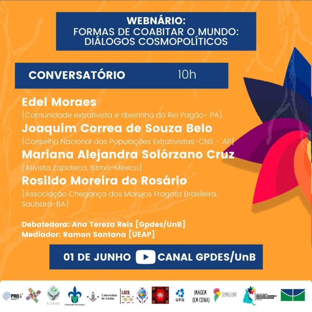O Grupo de pesquisa Educação, Saberes e Decolonialidades da Universidade de Brasília (GPDES/UnB) convida os(as) professores(as) e orientadores(as) educacionais para dois webnários no dia 1º de junho. Às 10h será realizado o conversatório Formas de Coabitar o Mundo: Diálogos Cosmopolíticos, que será transmitido pelo canal do GPDES no Youtube (https://youtu.be/BYXL1xEz3Vs). Às 17h será a vez do conversatório Ciências Ancestrais: Mundos e conhecimentos de outro modo, com transmissão pelo mesmo canal.