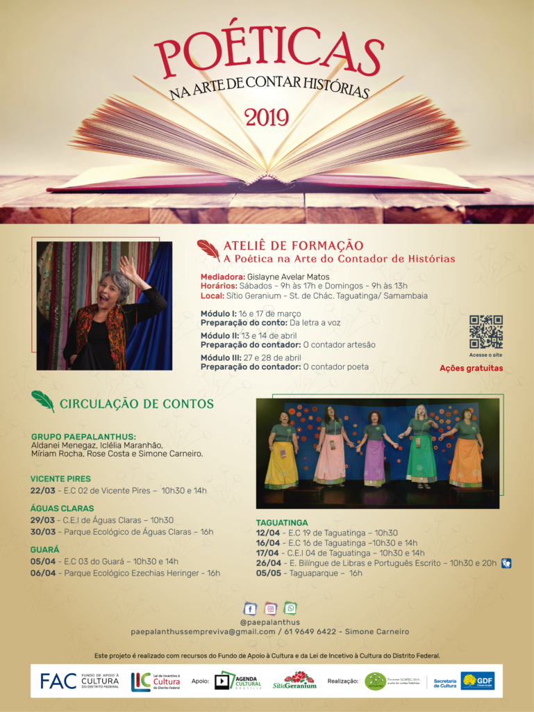 Para manter viva a arte de contar histórias, o Grupo Paepalanthus lança o projeto Poéticas na arte de contar histórias. O projeto, que será realizado até maio, criará uma oficina para aprender a arte, o Ateliê de formação, e ainda percorrerá escolas e parques do Distrito Federal levando contos e histórias diversas.