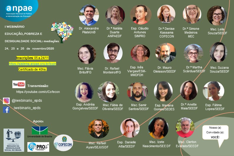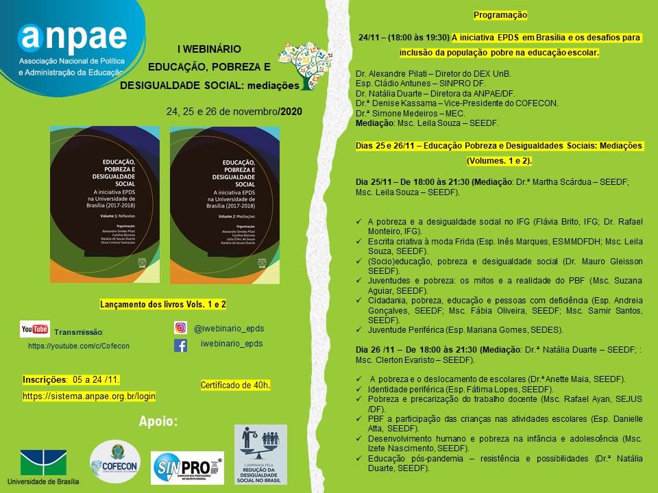 A Associação Nacional de Políticas e Administração da Educação (ANPAE- DF) realiza nos dias 24, 25 e 26 de novembro o I Webinário Educação, Pobreza e Desigualdade Social (EPDS). As inscrições serão encerradas nesta terça-feira (24) e podem ser feitas de forma gratuita no site da ANPAE: https://sistema.anpae.org.br/login.