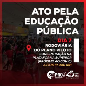 Professores(as) e orientadores(as) educacionais efetivos e temporários realizarão ato com panfletagem por direitos e em defesa do ensino público de qualidade, nesta quarta-feira (7/2). A ação será a partir das 15h, com concentração na plataforma superior da Rodoviária do Plano Piloto.