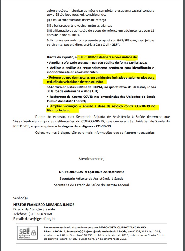 O ofício em questão foi publicado na tarde desta quinta-feira (2/6, fotos), pelo secretário adjunto de saúde Pedro Costa Zancanaro, e deliberava a necessidade de retomada da obrigatoriedade do uso de máscaras em locais fechados ou aglomerados do Distrito Federal.