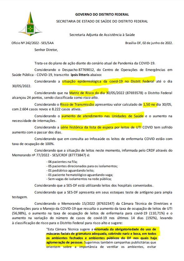 Diante da irresponsabilidade do governo do Distrito Federal, que prioriza ideologia e eleições e resolve, de forma política, ignorar uma nota técnica da Secretaria de Saúde, em detrimento do bem-estar da população do Distrito Federal, o Sinpro orienta que as escolas recomendem o uso de máscaras não só nas salas de aula como em todo o ambiente escolar. É sempre importante lembrar que a pandemia ainda não acabou. A nota da secretaria de Saúde (que, vamos frisar mais uma vez, é técnica) informa que há pacientes na fila para um leito de Covid, inclusive um pediátrico, como é possível ler na primeira página do ofício desta tarde.