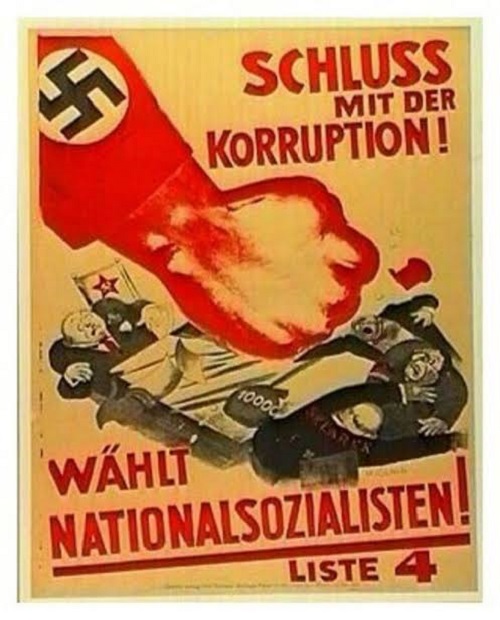 Jornalista da TV Câmara, Roberto Seabra, observou, em seu perfil, no Facebook, que “a propaganda nazista sempre usou o falso combate à corrupção para atacar os partidos de esquerda. O cartaz abaixo é do fim dos anos 1920, antes mesmo de Hitler assumir o comando da Alemanha. No detalhe, uma das vítimas do punho nazista é um homenzinho sentado em uma cadeira com o símbolo comunista estampado no encosto. Lembro disso porque, mal o governo do Bolsonaro se envolve em mais um escândalo de corrupção – com o secretário de Comunicação atuando em favor da própria empresa – o secretário da Cultura usa uma fala do ministro da propaganda de Hitler para desviar a atenção do principal”.