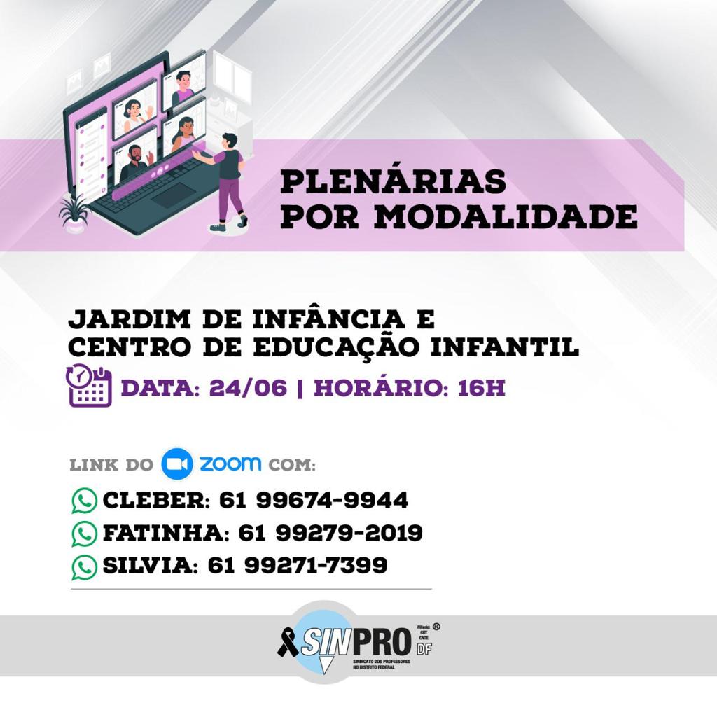 Nesta quinta-feira (24), às 16h, o Sinpro-DF dará continuidade às plenárias por modalidade. Desta vez, o sindicato convida a categoria para participar do encontro com os jardins de Infância e com os centros de Educação Infantil. A plenária segue o calendário de mobilizações aprovado pela categoria na última Assembleia Virtual e é realizada por meio da plataforma Zoom.