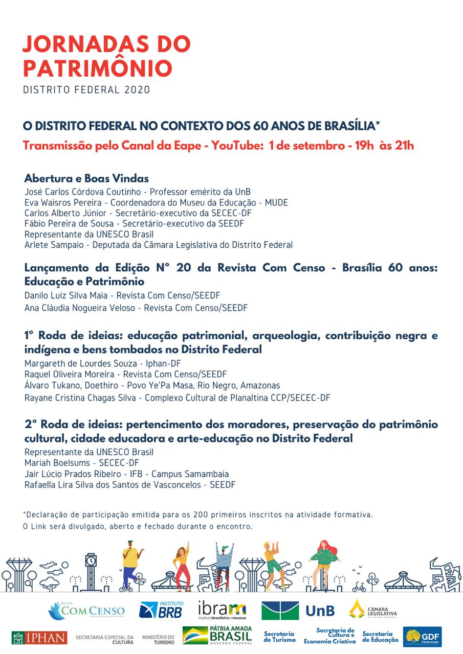 A Subsecretaria de Formação Continuada dos Profissionais da Educação (EAPE) realiza, nesta terça-feira, 1º de setembro, a Jornada do Patrimônio – O Distrito Federal no contexto dos 60 anos de Brasília. A transmissão será realizada pelo canal da EAPE – Youtube, das 19h às 21h. A declaração de participação será emitida para os(as) 200 primeiros(as) inscritos(as) na atividade formativa.