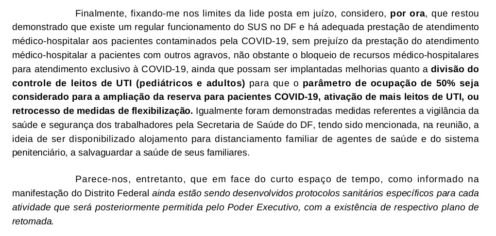 Só a decisão da juíza tem 25 páginas e é sustentada por vários pareceres médicos e científicos que indicam como, quando e o que deve ser feito para o DF ter segurança nesse retorno. A juíza condiciona cada etapa à verificação se todas as condições de segurança estão sendo atendidas. Uma das provas dessa rigidez é que o governador do DF decidiu criar outros hospitais de campanha, uma vez que nos processos movidos pelos Ministérios Públicos contra o relaxamento do isolamento feito em abril, Ibaneis não conseguiu comprovar que o número de leitos de UTI era suficiente para as próximas fases da pandemia.