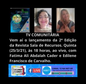 A diretoria colegiada do Sinpro-DF convida a todos e todas para o lançamento virtual da segunda edição da revista “Sala de Recursos”, nesta quinta-feira (25), 18h, pela TV Comunitária de Brasília no canal 12 da NET e pelo Facebook da TV.
