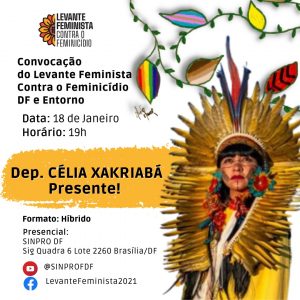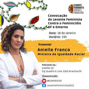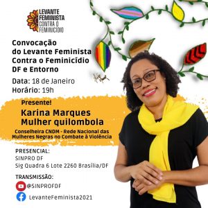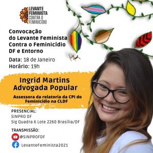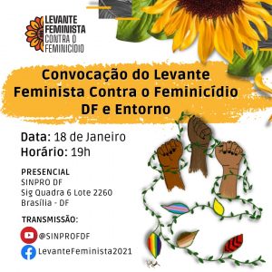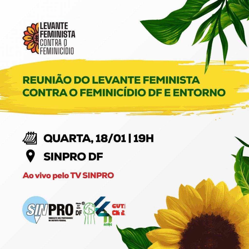 Levante Feminista Contra o Feminicídio do DF e entorno realizará reunião nesta quarta-feira (18/01), às 19h. A atividade será no auditório do Sinpro-DF, com transmissão ao vivo pelo TV Sinpro.