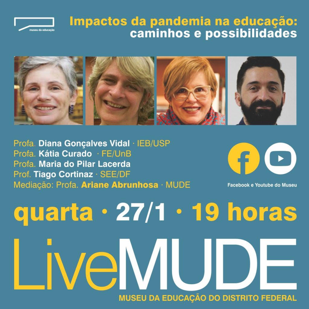Um time de três professoras e um professor realizará debate virtual nesta quarta-feira (27) e pautará os impactos da pandemia na educação, apontando caminhos e possibilidades. A atividade será às 19h, com transmissão no canal do Youtube e página do Facebook do Museu da Educação do DF (Mude), que realiza a ação.