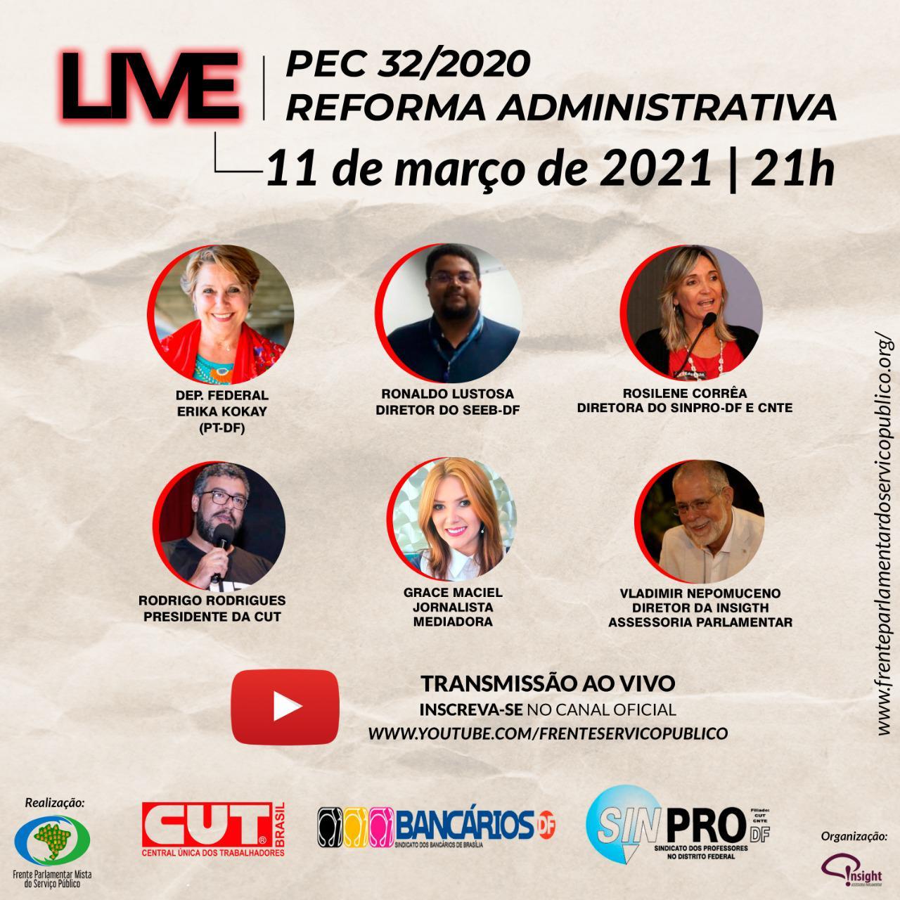 A Frente Parlamentar Mista do Serviço Público, juntamente com o Sinpro, a CUT Brasília e o Sindicato dos Bancários, realiza nesta quinta-feira (11), às 21h, uma Live sobre a reforma Administrativa (PEC32/2020). Dentre os convidados que participarão da atividade estão a deputada federal Erika Kokay; o diretor do SEEB-DF, Ronaldo Lustosa; a diretora do Sinpro e da CNTE, Rosilene Corrêa; o presidente da CUT DF, Rodrigo Rodrigues; e o diretor da INSIGTHY Assessoria Parlamentar, Vladimir Nepomuceno. A mediação ficará por conta da jornalista Grace Maciel.