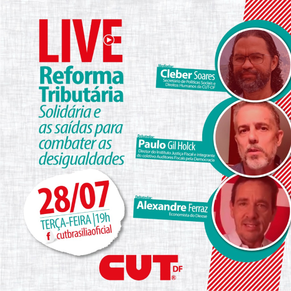 Participarão do debate o secretário de Políticas Sociais e Direitos Humanos da CUT-DF, Cleber Soares; o diretor do Instituto de Justiça Fiscal e integrante do Coletivo Auditores Fiscais Pela Democracia, Paulo Gil Holck; e o economista do Departamento Intersindical de Estatística e Estudos Socioeconômicos (Dieese), Alexandre Ferraz.