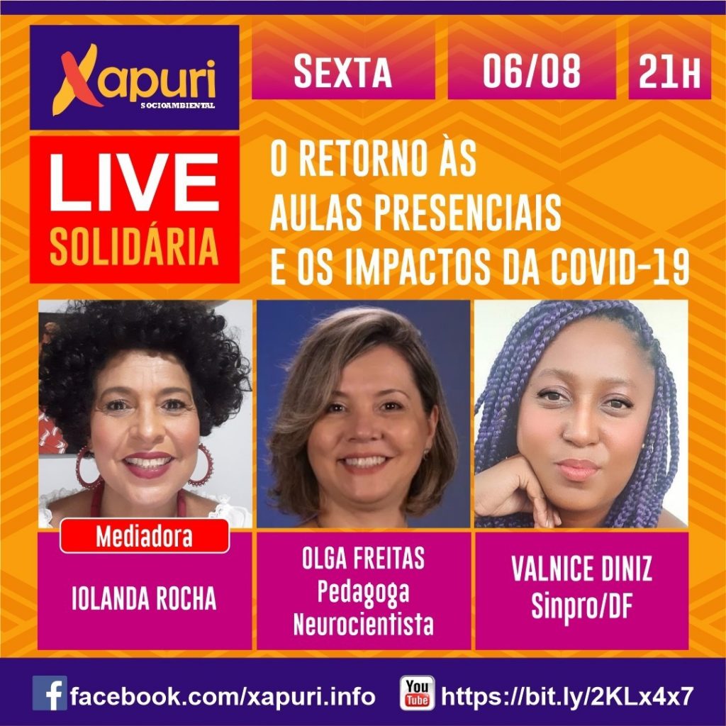 A Xapuri Socioambiental realiza live solidária nesta sexta-feira, 6, com o tema O retorno às aulas presenciais e os desafios da Covid-19. Participarão do debate a diretora do Sinpro Vanilce Diniz e a pedagoga e neurocientista Olga Freitas. A mediação será da professora Iolanda Rocha.