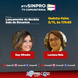 Para debater mais sobre o projeto, nesta quinta-feira (5), às 17h45, acontecerá uma live para o lançamento oficial da revista “Sala de Recursos”. A transmissão será ao vivo  pela TV Comunitária no canal 12 da NET,  pelo Facebook e Youtube do Sinpro. Para o debate, participará, Ray Oliveira e Luciana Reis, idealizadoras e colaboradoras da revista.