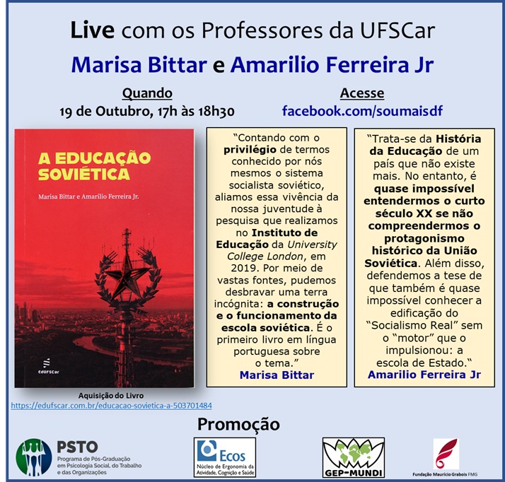 Na próxima terça-feira (19), o Programa de Pós-Graduação em Psicologia Social, do Trabalho e das Organizações (PSTO), o Núcleo de Ergonomia da Atividade, Cognição e Saúde (Ecos) e o Grupo de Pesquisa de Estudos e Pesquisas sobre Mundialização da Educação (GEP-Mundi), todos da UnB, em parceria com a Fundação Maurício de Grabois, apresentam live de lançamento do livro A Educação Soviética, dos professores Marisa Bittar e Amarilio Ferreira Jr., docentes do Departamento de Educação (DEd) da UFSCar (Universidade Federal de São Carlos).