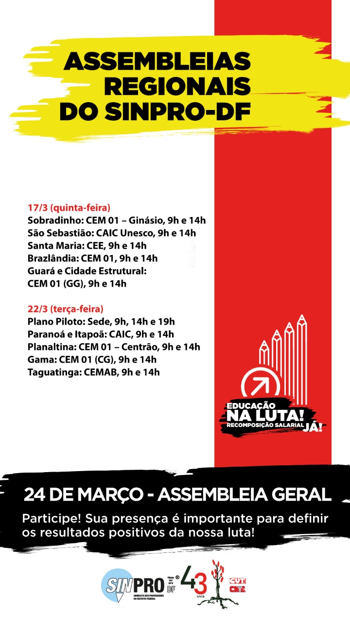 O Sinpro convoca a categoria para participar de mais cinco assembleias regionais, que ocorrem nesta quinta-feira, 17 de março, em várias cidades-satélite, e em dois horários: 9 e 14h. Confira as assembleias de quinta-feira, 17/03:
