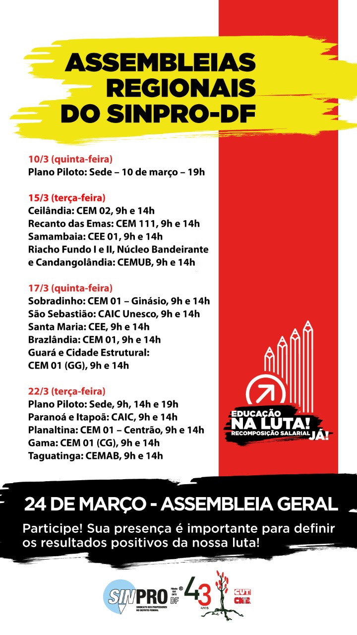 O Sinpro convoca a categoria para participar de mais quatro assembleias regionais, que ocorrem nesta terça-feira, 15 de março, em várias cidades-satélite, e em dois horários: 9 e 14h. Confira as assembleias de terça-feira, 15/03: