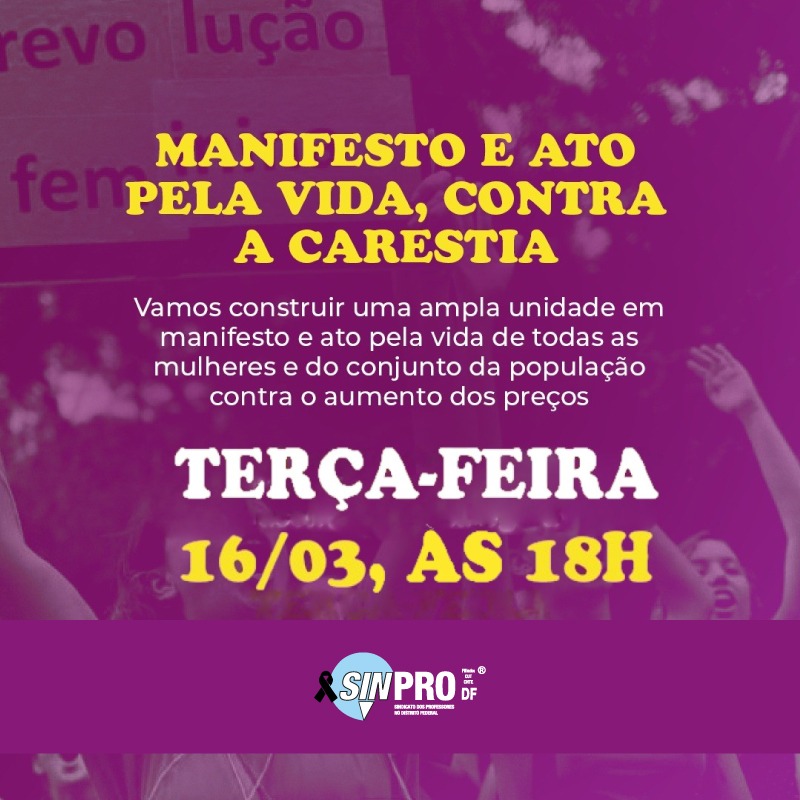 A Confederação Nacional dos Trabalhadores em Educação (CNTE), o Sinpro e várias entidades sindicais se unem a um ato pela vida de todas as mulheres e contra o aumento dos preços dos alimentos. Com o título de Manifesto e ato pela vida, contra a carestia, a CNTE realiza uma Live nesta terça-feira (18), às 18h, para abordar os dois temas e debater meios para diminuir o índice de violência doméstica e feminicídios, além de mecanismos contra o aumento no valor dos alimentos.