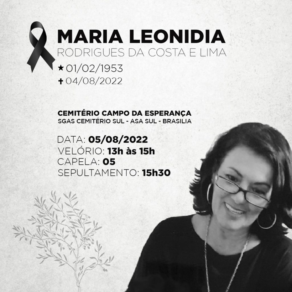 O velório da professora Maria Leonidia acontecerá nesta sexta-feira, 05, de 13h a 15h, na Capela 5 do Cemitério Campo da Esperança. O sepultamento está marcado para 15h30.