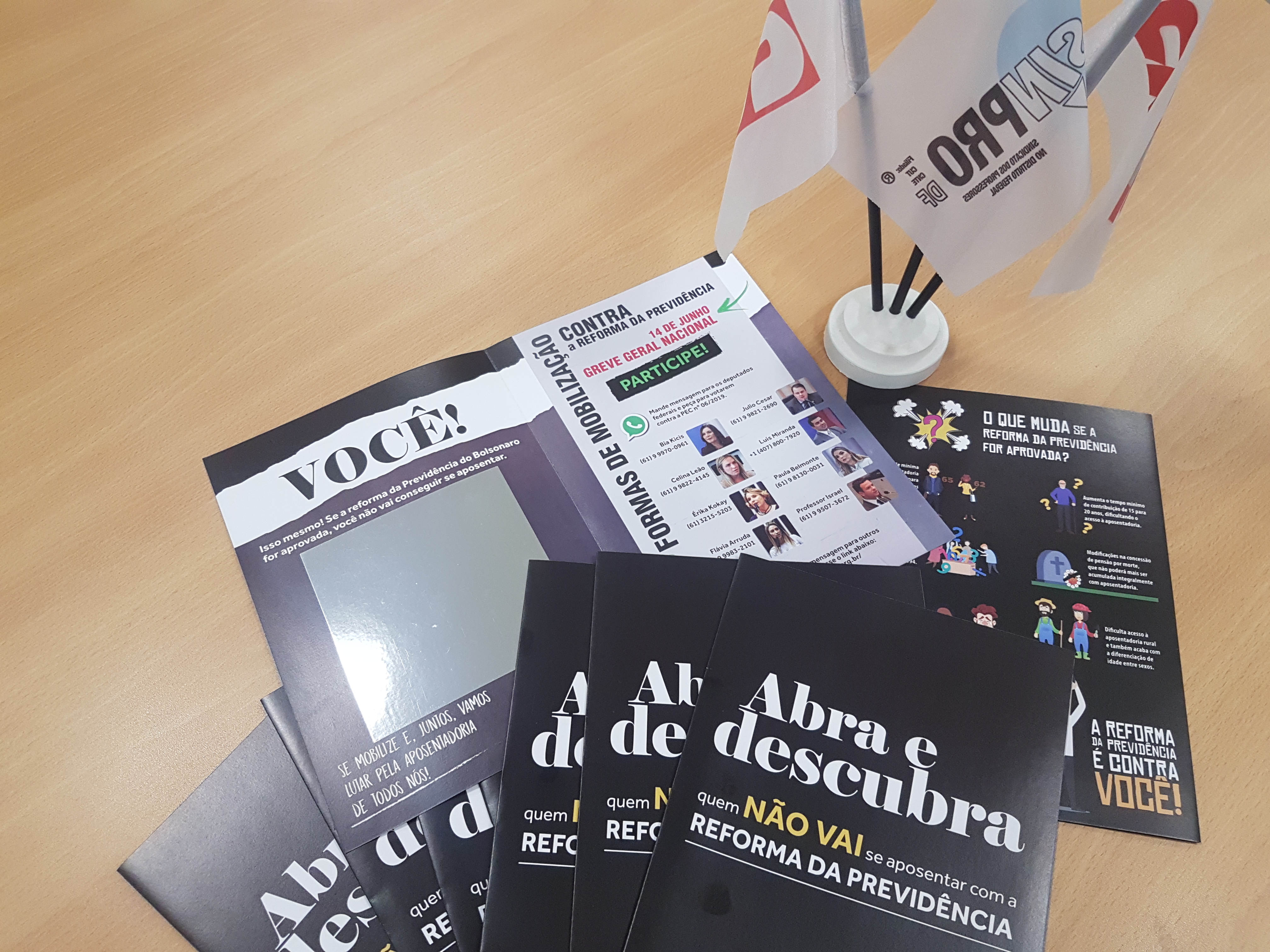 Juntamente com a cabine o Sinpro entregou um panfleto espelho explicando os prejuízos da reforma, disponibilizando contatos telefônicos dos parlamentares do Distrito Federal para que cada um ligue e peça para votar contra.
