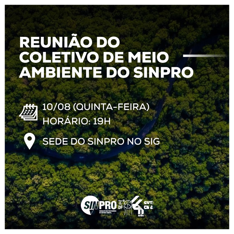O Coletivo de Meio Ambiente do Sinpro convida professores(as) e orientadores(as) educacionais da rede, interessados e engajados na defesa do meio ambiente, para sua próxima reunião! O encontro será nesta quinta-feira, 10 de agosto, às 19h, na sede do Sinpro no SIG. A reunião vai retomar os trabalhos do coletivo e construir um plano de ação até o final do ano, com atividades públicas de mobilização para a pauta e ações de aprofundamento do debate.