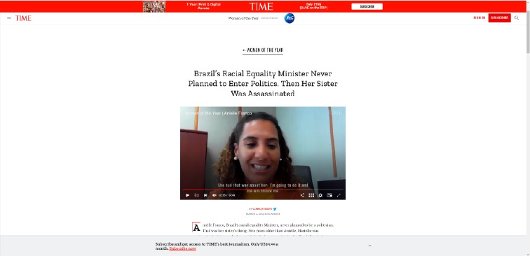 No perfil de Anielle, a reportagem lembra que Anielle tem, hoje, a mesma idade da irmã quando foi assassinada, mas “Anielle se encontra em uma posição muito mais proeminente do que sua irmã poderia imaginar, com uma chance real de realizar seu sonho de um Brasil mais justo. Franco assumiu o cargo em janeiro como Ministra da Igualdade Racial depois que Luiz Inácio Lula da Silva derrotou Bolsonaro nas eleições de outubro. O trabalho de Anielle é garantir que os ministros e legisladores de Lula cumpram sua promessa de igualdade para os negros e mestiços brasileiros, que representam 56% da população, e as minorias indígenas e asiáticas do país.”