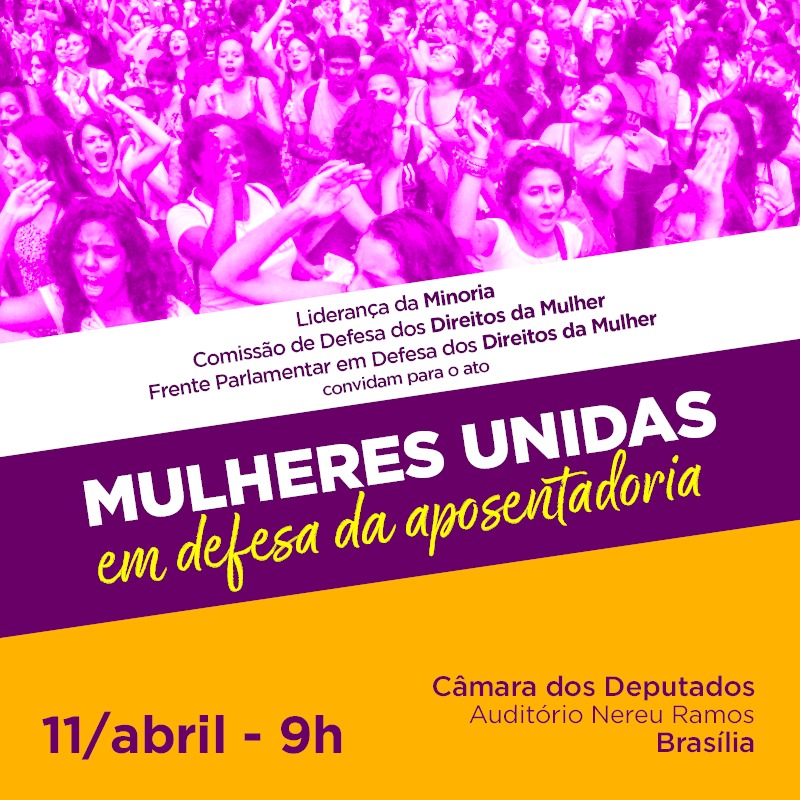 A Liderança da Minoria, a Comissão de Defesa dos Direitos da Mulher e a Frente Parlamentar em Defesa dos Direitos da Mulher convidam os(as) professores(as) e orientadores(as) educacionais para o ato Mulheres Unidas em defesa da aposentadoria. A atividade acontecerá nessa quinta-feira (11), às 9h, no Auditório Nereu Ramos, na Câmara dos Deputados.