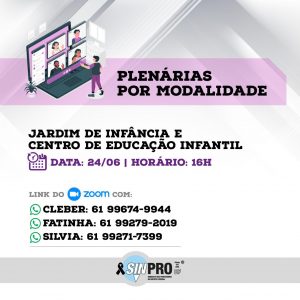 O Sinpro-DF convida a categoria para participar de mais uma edição das plenárias por modalidade. Nesta quinta-feira, 17, às 16h, será a vez do encontro com os Centros Educacionais e de Ensino Médio. A plenária segue o calendário de mobilizações aprovado pela categoria na última Assembleia Virtual e é realizada por meio da plataforma Zoom.