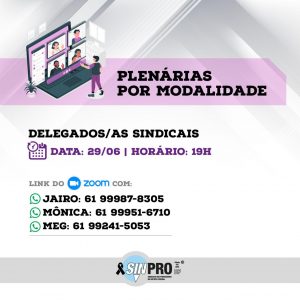 Havendo atividades ou mobilizações na mesma data ou horário das plenárias, o Sinpro-DF poderá alterar o horário do encontro remoto. Caso isso aconteça, toda e qualquer mudança será informada em nossos canais de comunicação e redes sociais.